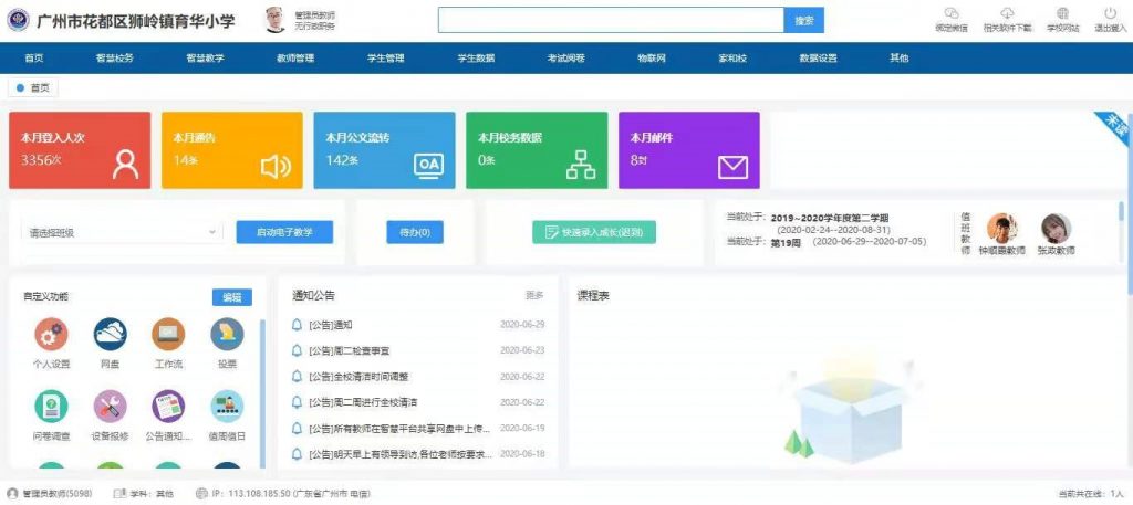 目前,育华小学智慧校园平台已在学校全面应用,消除了以前的信息孤岛现象,学校的教学、管理等溶合成为了一个大平台。所有教室的电脑、一体机都已安装电子教学系统,全校所有老师均下载手机APP。学校教师、学生基础数据已全部上传到平台,并通过应用开始产生新的数据;在学校老师的应用过程中,平台已经累计操作10万人次。其中,疫情防控帮助所有教师实现近期的自主体温登记;会议人员签到也全部由平台活动管理进行登记;老师通过设备报修模块实现了对近期校内所有损坏设备的快速报修……智慧校园平台融入到学校的日常学习、生活、管理中,受到学校领导和老师的高度认可和一致好评。