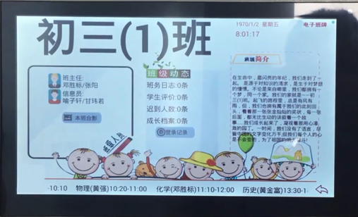 平台提供电子班牌与平台的智能集成,电子班牌是一种安装在教室门口,用来实时显示学校通知、班级通知,可设置集中分布式管理,自由控制每个终端;显示班级的基本信息、班级风采展示、班级公告,包括天气、班名、课程表、值日表等等的液晶显示班牌,使每个班级更具现代化特色;